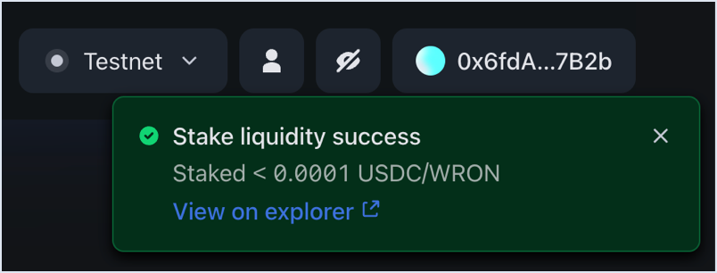 Confirm the transaction in your Ronin Wallet. When the transaction completes, Katana displays a confirmation pop-up.