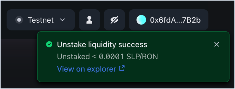 Confirm the transaction in your Ronin Wallet. When the transaction completes, Katana displays a confirmation pop-up.