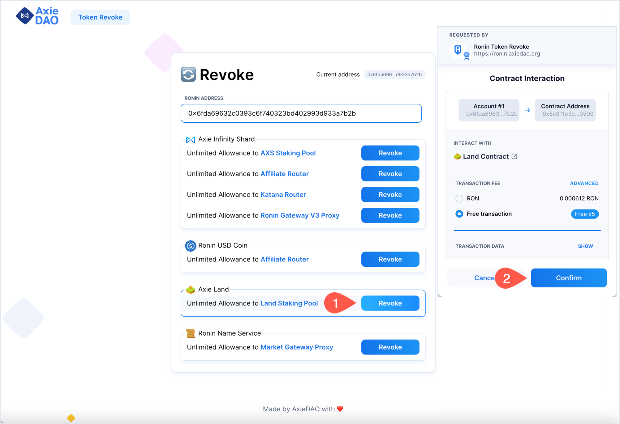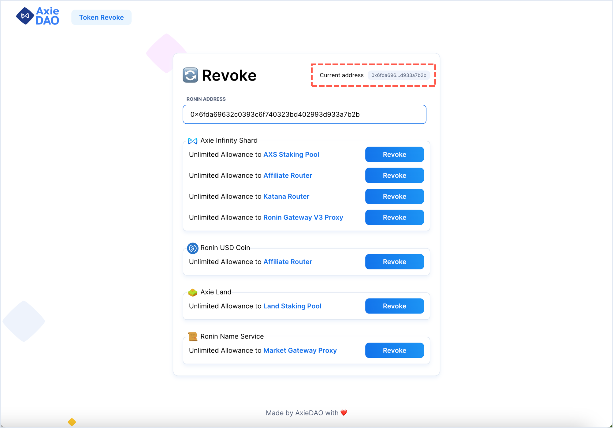 Ronin Token Revoke ("Revoke" for short) is a tool built for revoking approvals that you previoisly granted to a Ronin dApp's smart contract to handle your digital assets, such as tokens and NFTs.