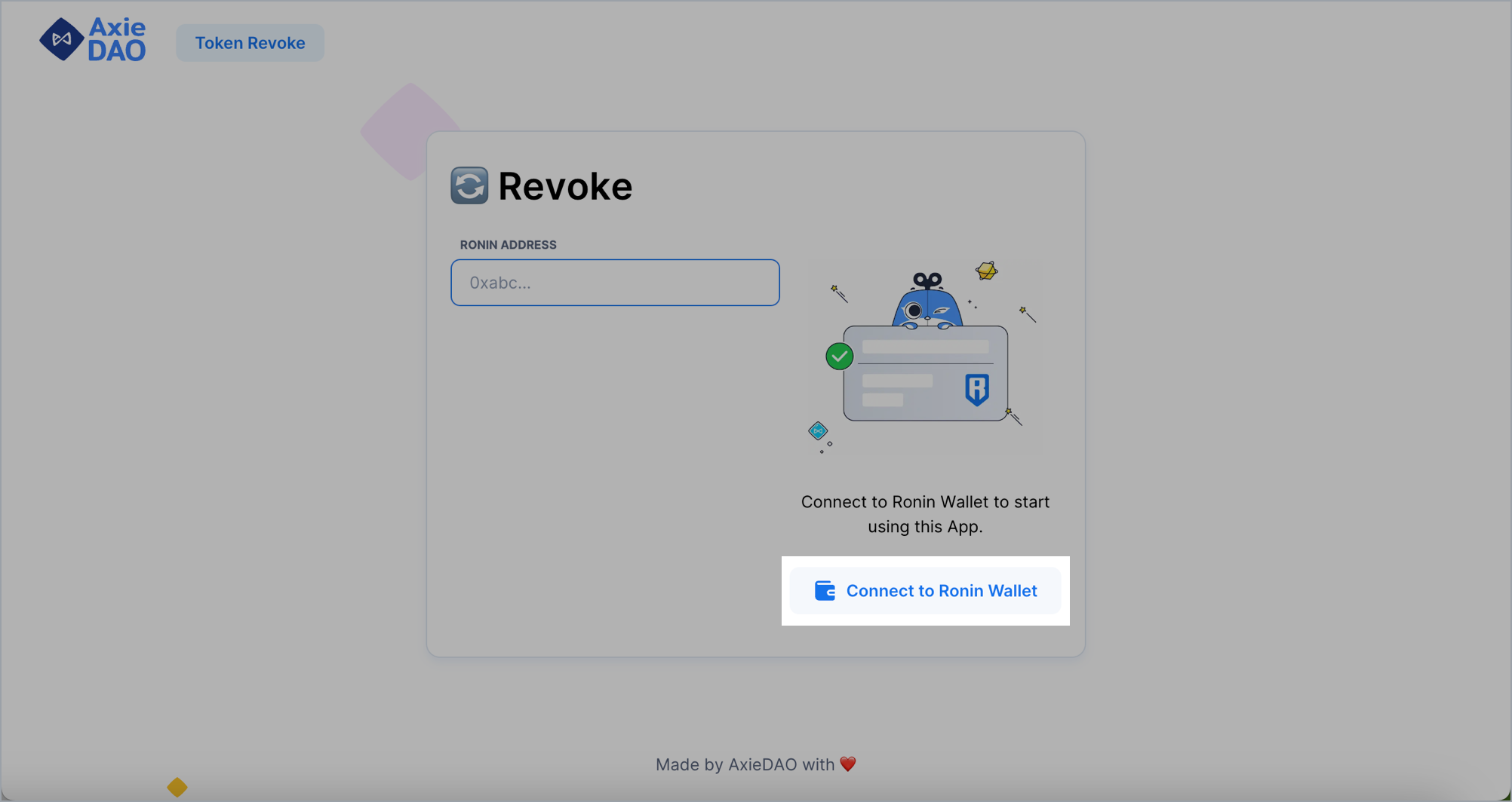1. Open the Revoke tool and click Connect to Ronin Wallet.